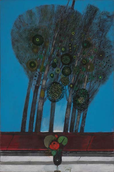 درختان ازلی ابوالقاسم سعیدی همچون اثر پیش‌رو، همیشه بلند و کشیده هستند. گاه برگ‌های انبوه دارند و گاهی شاخه‌های لخت سر به فلک کشیده خود را به دست باد می‌سپارند. حضور باد در آثار وی چنان وزان و پُرصداست، که همواره ترکیب‌بندی موربی از درختان رقصان را ایجاد می‌کند؛ حتی اگر همچون اثر حاضر در پشت پنجره و در پس شیروانی‌های سرخ‌رنگ قرار گرفته باشند.اگر چه خورشید بر خلاف بسیاری از آثار سعیدی، در این اثر نمی‌درخشد، اما تابش غیرمستقیم آن بر این فضای بهاری طربناک محسوس است. غیبت فیگور در آثار سعیدی، این‌جا به سبب وجود گلدان گل و شیروانی‌های جلوی تصویر، نشان از حضوری انسانی می‌دهند.