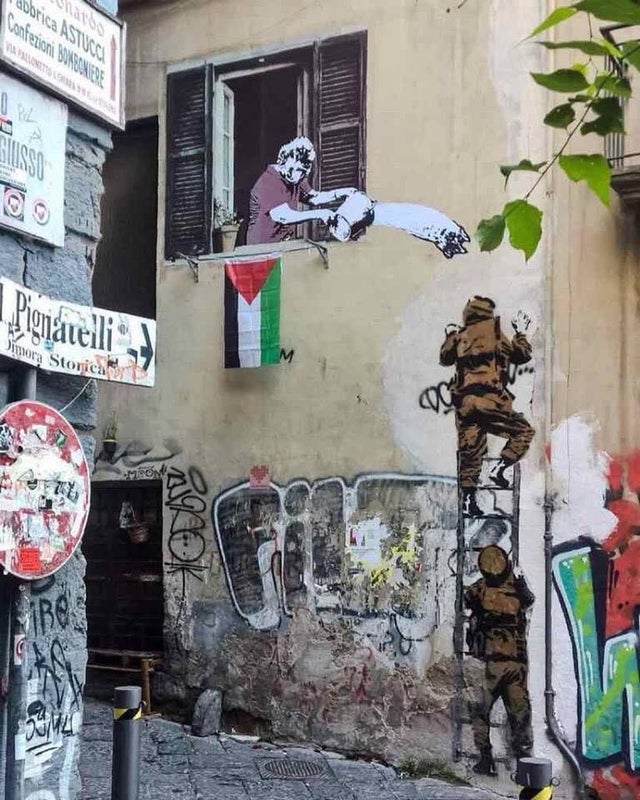 یکی از تازه‌ترین نقاشی‌هایی که روی دیواری در شهر ناپل پدیدار شده، دو سرباز صهیونیست را هنگام بالا رفتن از دیوار یک خانه نشان می‌دهد. از آن بالا یک شهروند ناپلی که زنی خانه‌دار است دارد روی اشغالگران آب می‌ریزد تا دورشان کند و نگذارد وارد حریم خانه شوند. کاستالدو می‌گوید: «آب ریختن روی مزاحم‌ها کاری است مردم ناپل معمولا انجام می‌دهند. مثلا می‌خواهند به کودکانی که سر و صدا می‌کنند، می‌گویند بروند پی کارشان.»