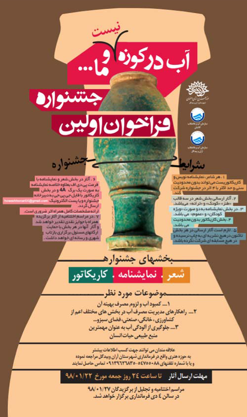 خلیلی افزود: موضوعات جشنواره ی «آب در کوزه نیست و ما...» کمبود آب و لزوم مصرف بهینه آن، راهکارهای مدیریت مصرف آب در بخشهای مختلف، جلوگیری از آلودگی آب به عنوان مهمترین منبع طبیعی حیات انسان است که علاقه مندان می توانند تا ساعت ۲۴ روز شنبه 15 تیرماه آثار خود را با این موضوع به جشنواره ارسال نمایند.