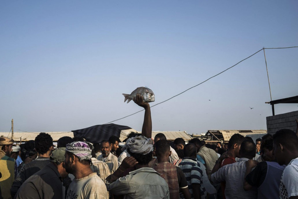 در توضیح این عکس از یمن آمده است: مردانی که در بازار ماهی فروشان یمن در نزدیکی بندر کار میکنند. درگیریهای مسلحانه در جریان به شدت ماهیگیران را تهدید میکنند. تعداد اندکی از آنان برای صید به دریا میروند. گفته میشود قایقهای ماهیگیری مورد هدف نیروهای ائتلاف سعودی قرار گرفته و نابود شدهاند.